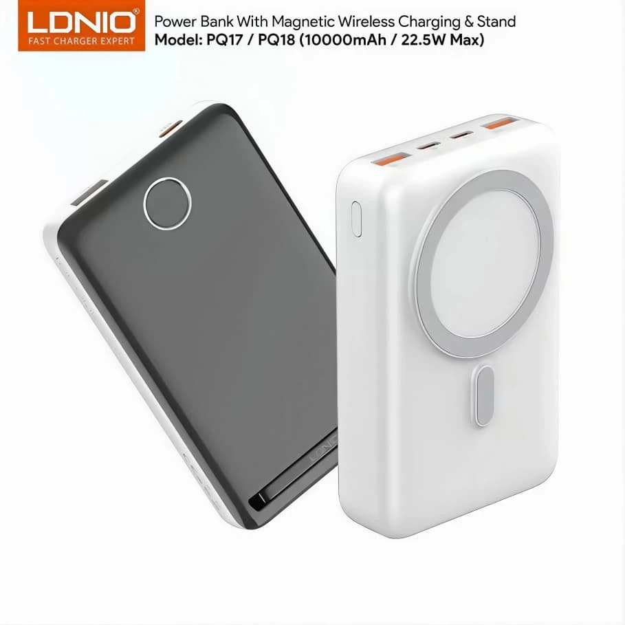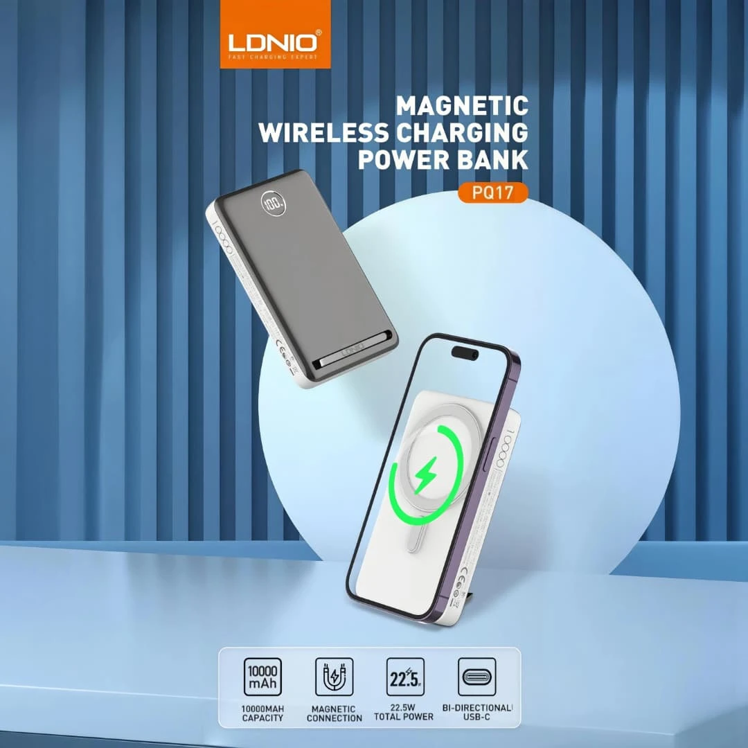 The LDNIO Power Bank PQ17 is a portable charger with a 10,000 mAh capacity, offering reliable power to recharge smartphones, tablets, and other devices on the go. It supports fast wired charging up to 22.5 W via USB‑C and USB‑A ports and features 15 W magnetic wireless charging for compatible devices without the need for cables. Its compact, travel‑friendly design includes an LED display that shows remaining battery level and built‑in safety protections against overcharge, overheating, and short circuits for secure charging wherever you are.