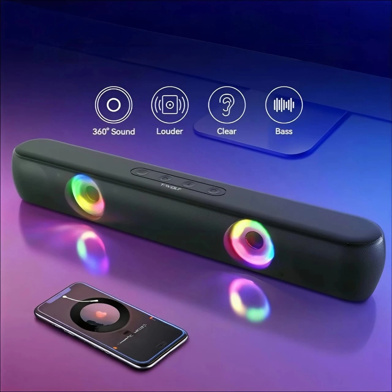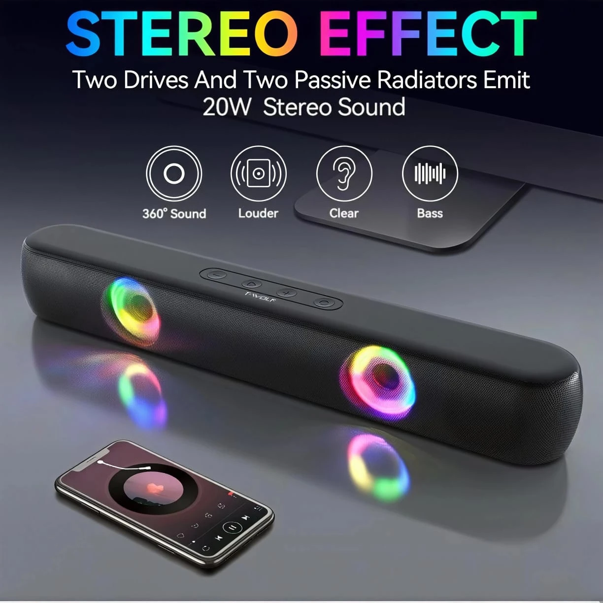 The T-WOLF BT320 Bluetooth Desktop Speaker is designed to deliver powerful stereo sound with dual 5W drivers and stable Bluetooth 5.0 connectivity for smartphones, laptops, and tablets. It features a sleek soundbar-style design ideal for desktop setups and includes colorful RGB lighting effects to enhance the gaming or music atmosphere. The speaker supports multiple playback modes including Bluetooth, USB, AUX, TF card, and FM radio, and comes with a built-in rechargeable battery for convenient portable use.