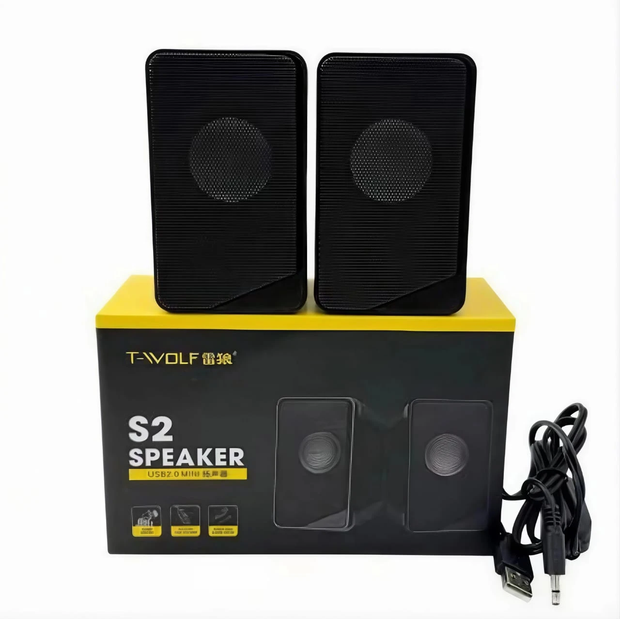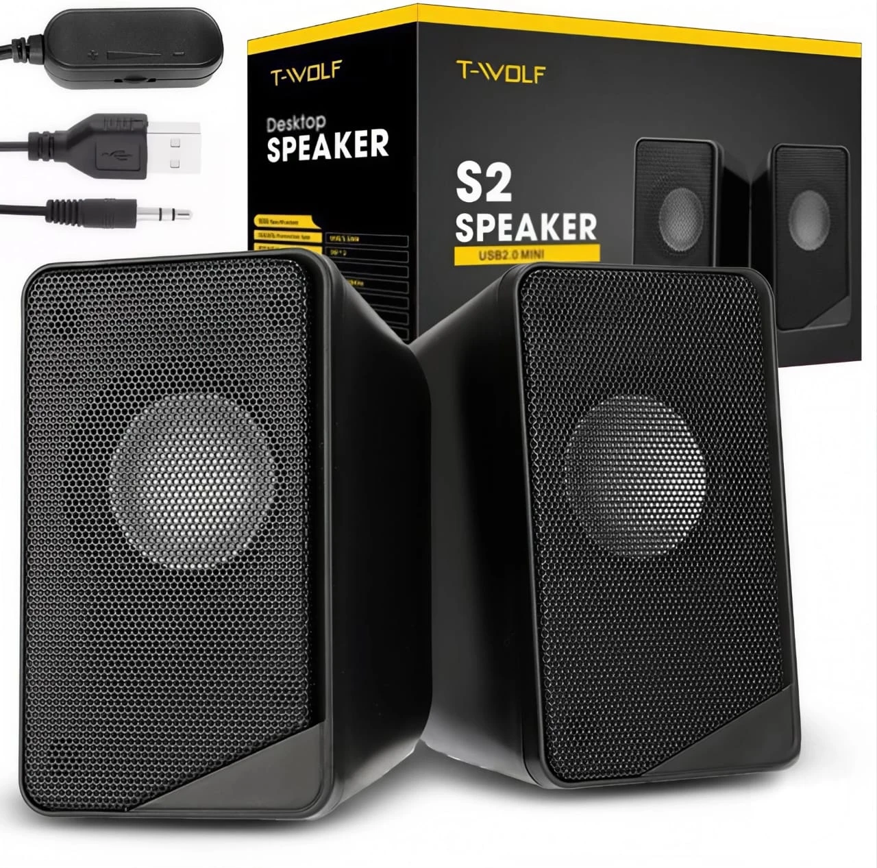 The T-WOLF S2 Stereo Computer Speaker is designed for PCs and laptops, delivering clear stereo sound suitable for music, videos, and gaming. It connects via a 3.5mm audio jack with USB power, allowing quick and easy setup without complicated installation. The compact and stylish design fits well on any desk and includes convenient volume control for easy operation.