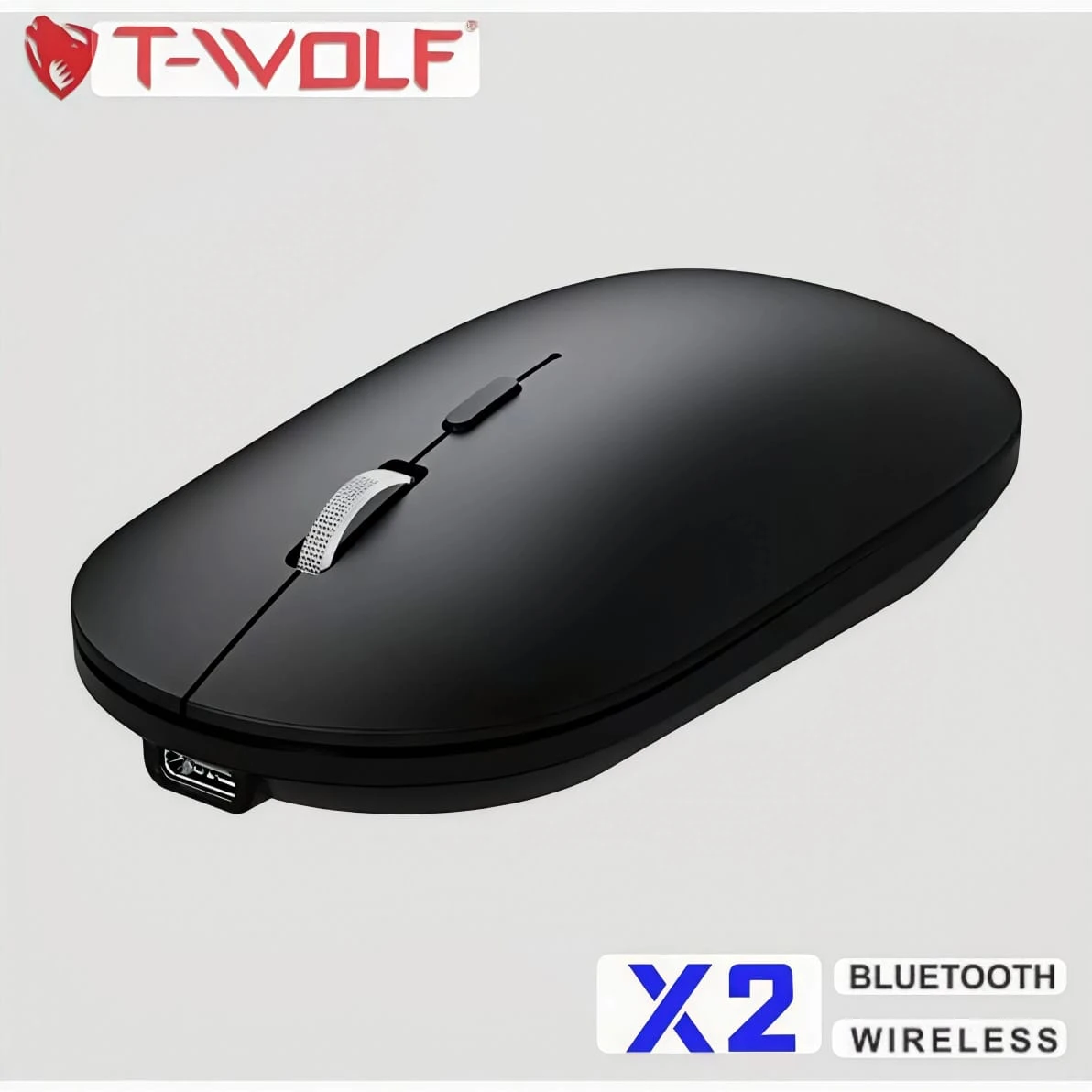 The T-WOLF X2 Wireless Mouse is designed for laptops and desktop computers, offering a lightweight and stylish design suitable for office work and everyday use. It supports dual connectivity via Bluetooth 5.0 or 2.4GHz wireless USB receiver, providing a stable connection with a working distance of up to 10 meters. The mouse features adjustable DPI levels (800 / 1200 / 1600) for precise control during browsing, work, or general computer tasks. It also includes a rechargeable lithium battery (around 600mAh) with USB-C charging and silent click buttons that reduce noise, making it ideal for quiet environments such as offices and study areas.