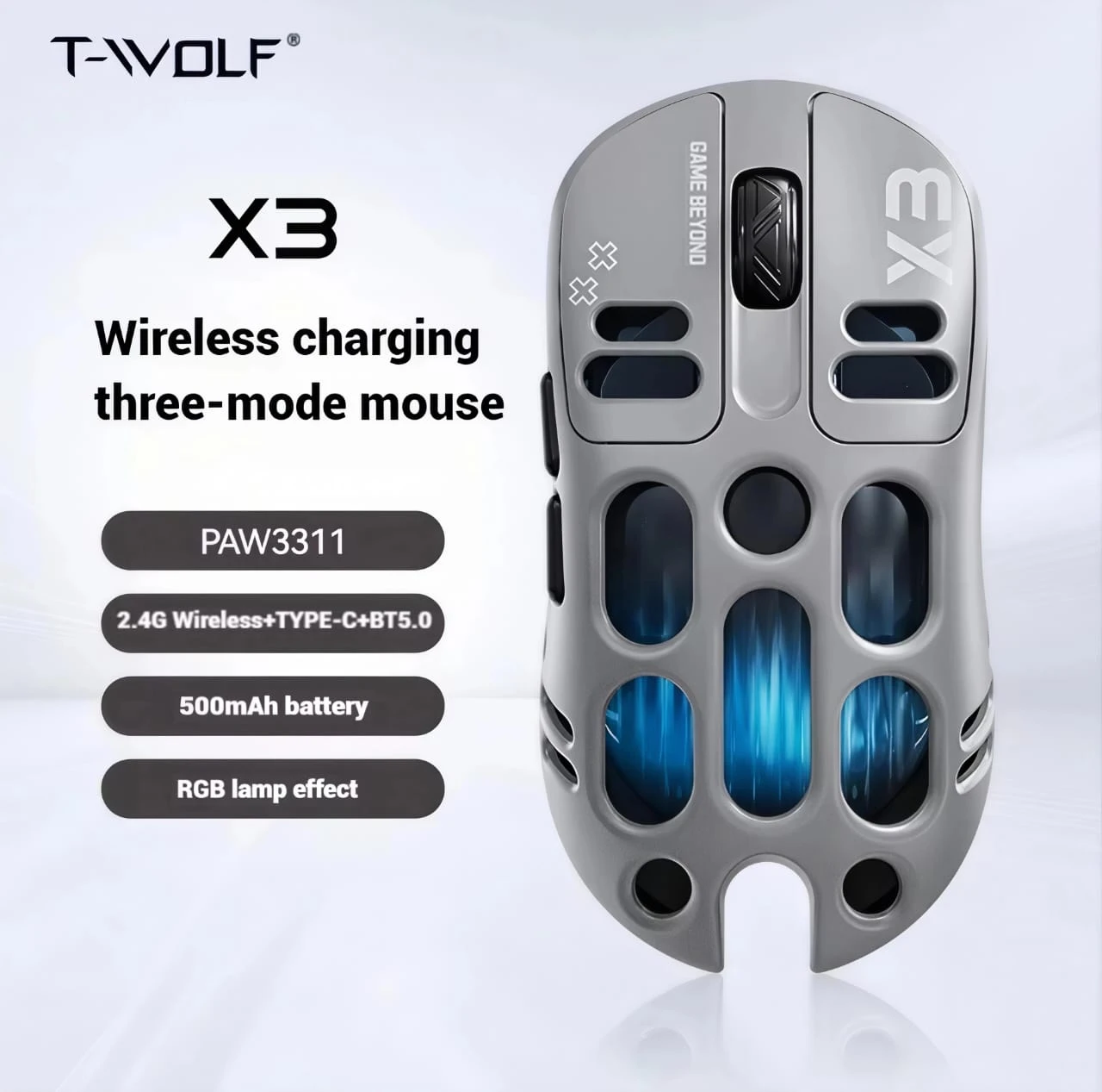 The T‑WOLF X3 Tri‑Mode Wireless Gaming Mouse is designed for gamers seeking versatile connectivity and solid performance at an affordable price. It supports tri‑mode connection — wired via USB‑C, 2.4GHz wireless, and Bluetooth 5.1 — allowing easy switching between devices. Equipped with an optical sensor with adjustable DPI from 800 up to 12,000, this mouse handles various gaming and productivity scenarios. The RGB lighting adds a stylish gaming look, while its lightweight honeycomb design reduces fatigue during long sessions. Powered by a 500mAh rechargeable battery with Type‑C charging, and featuring 6 durable buttons, this mouse offers reliable performance for extended use.