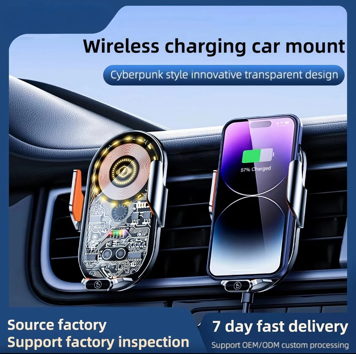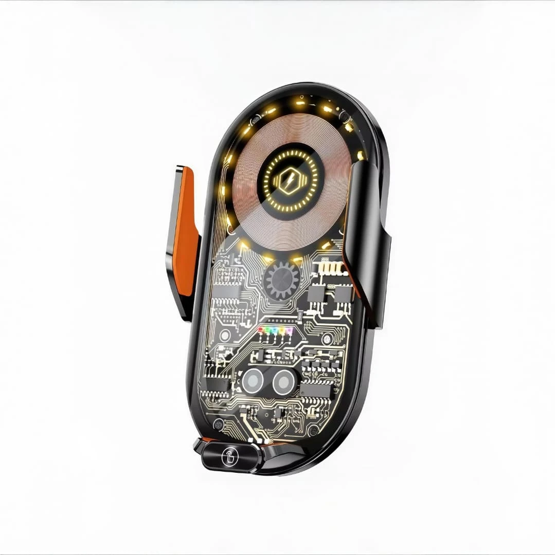 A 2-in-1 smart wireless car charger and phone holder featuring a modern transparent design. It is equipped with infrared sensing technology that allows the holder to automatically open and close when your phone approaches, enabling convenient one-hand operation while driving. It supports fast wireless charging up to 15W for Qi-enabled devices, while securely holding your phone in place even on rough roads. The charger is easy to install on air vents or dashboards, making it a practical and reliable accessory for everyday use in your car.