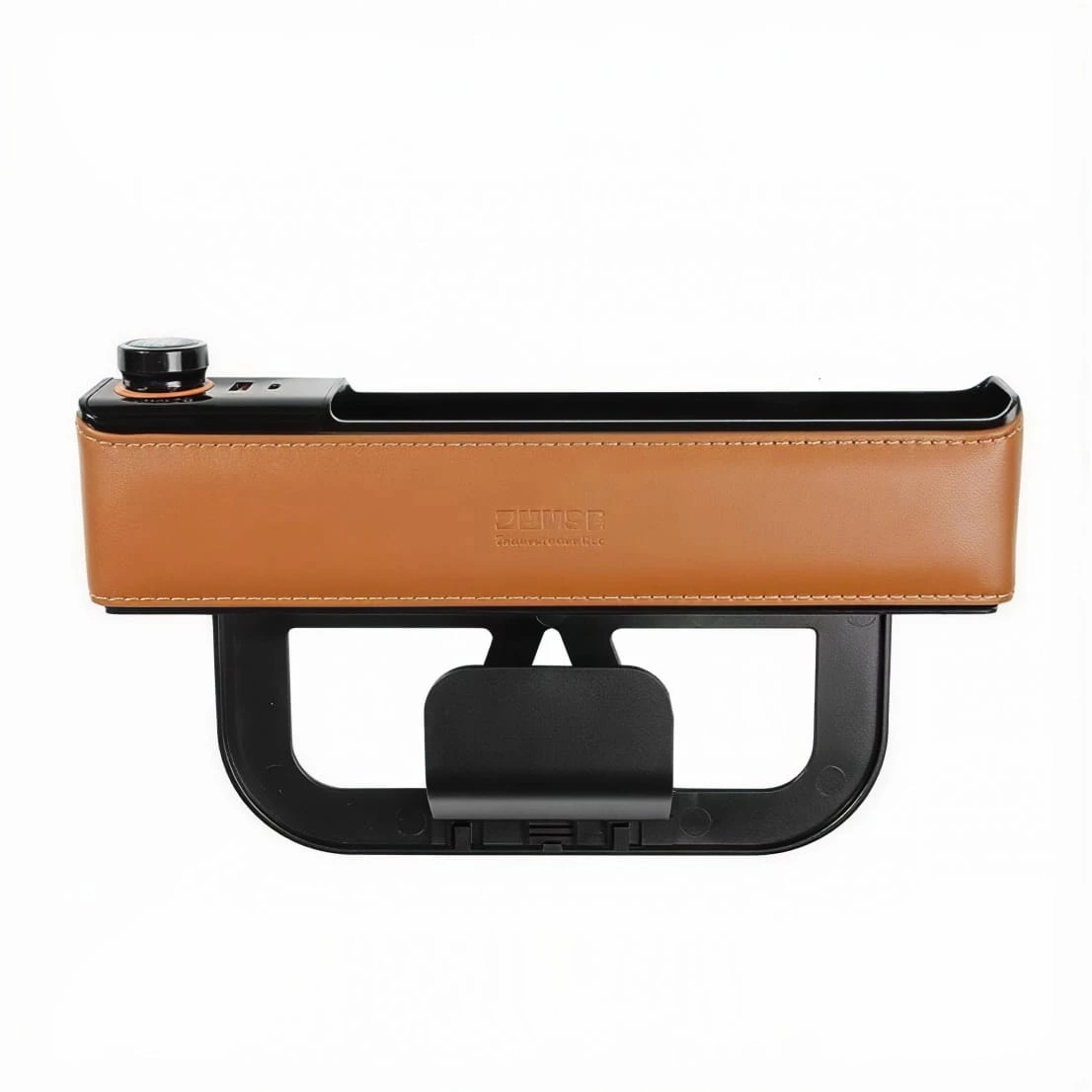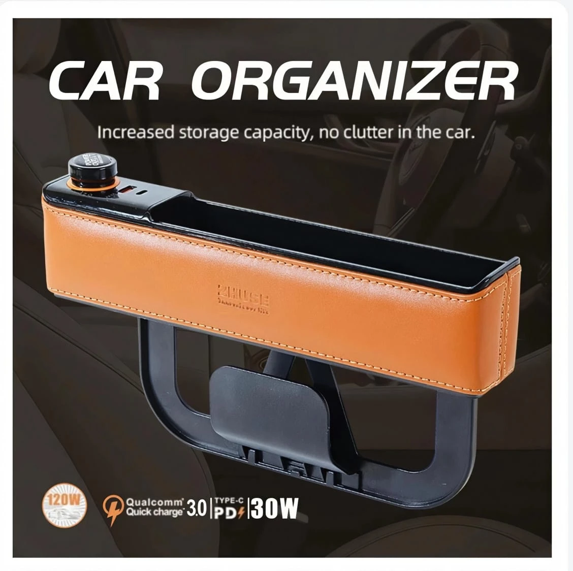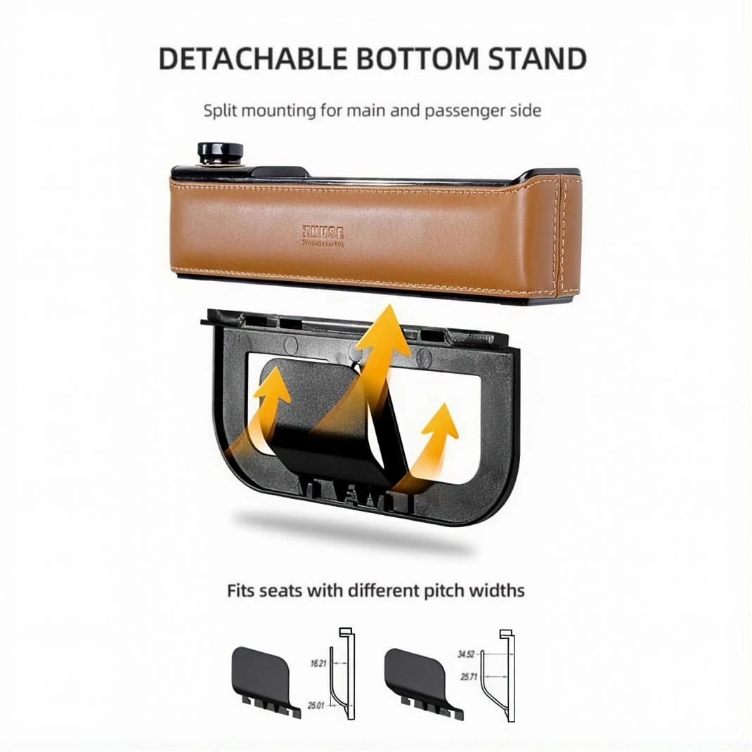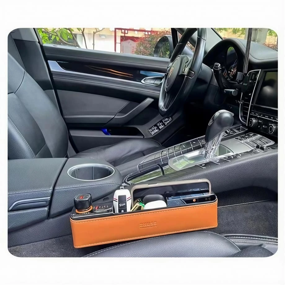 A car seat gap organizer designed to fit between the seat and center console, providing extra storage space inside your vehicle. It helps prevent small items such as phones, keys, cards, and coins from falling into the seat gap. Made from durable materials such as PU leather or plastic, it features an easy installation design with no tools required. It keeps your car interior organized and clutter-free while driving.