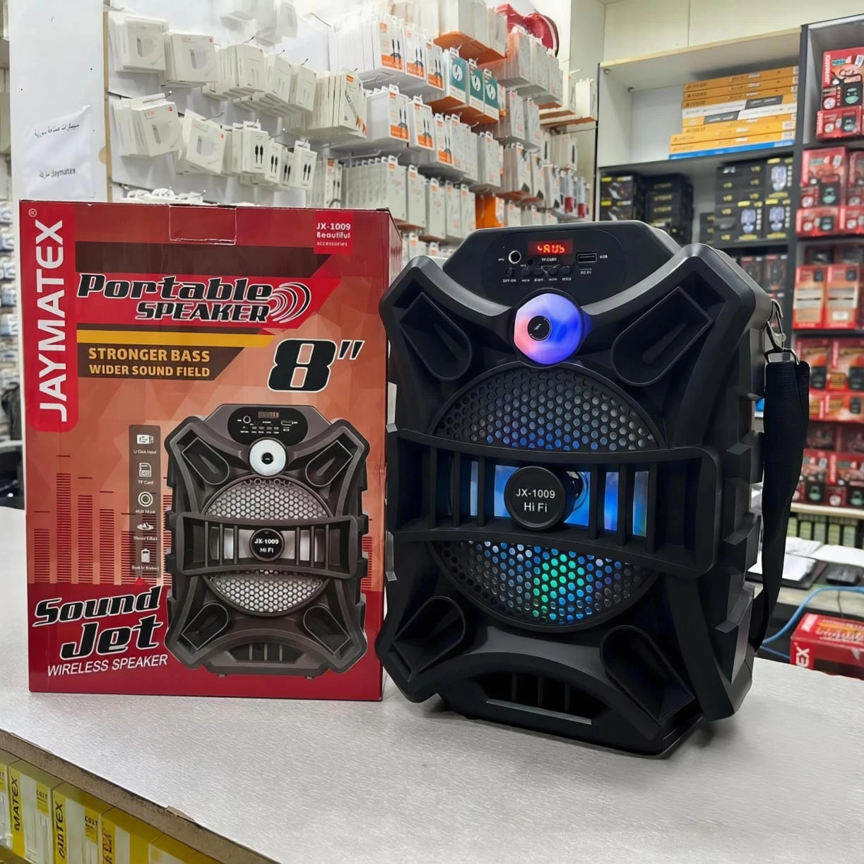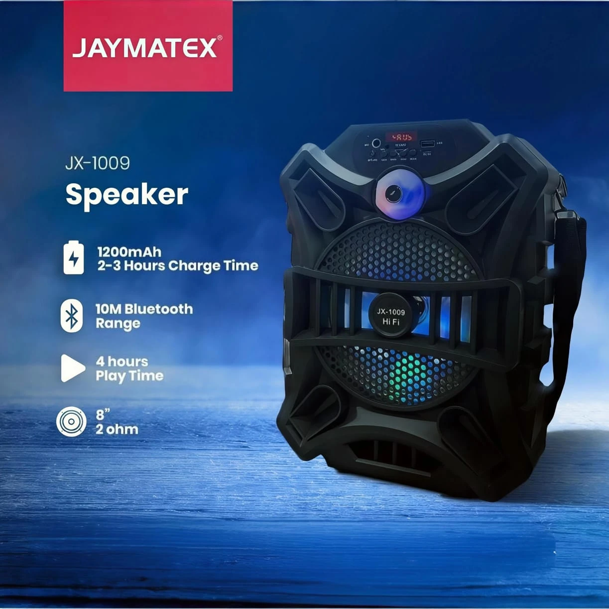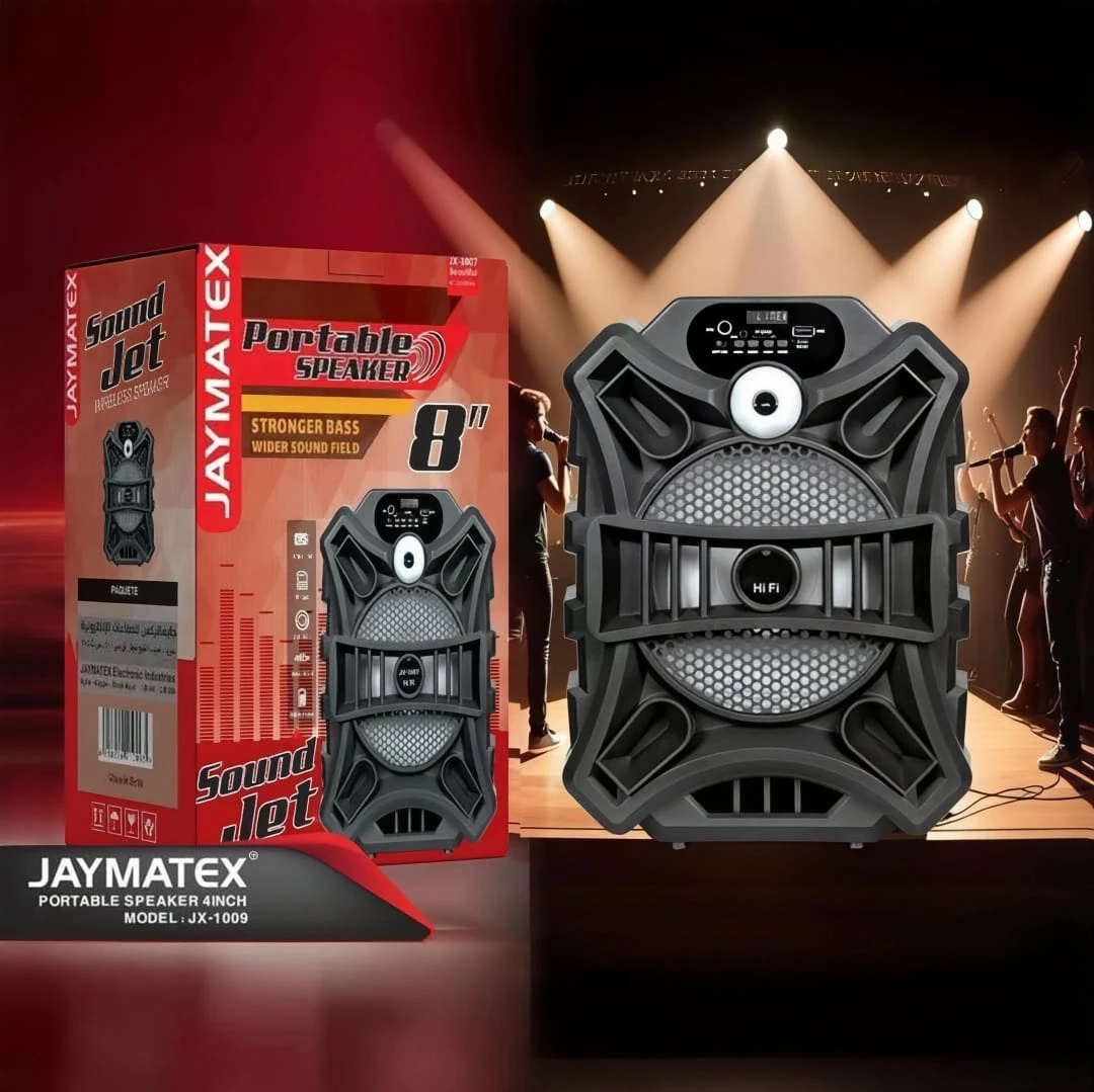 The Jaymatex 1009 Bluetooth Speaker is a portable wireless speaker delivering clear and powerful sound for music, podcasts, or calls anywhere. It comes with built-in LED lights for an enjoyable visual experience while listening. Featuring fast Bluetooth connectivity with smartphones and smart devices, its compact and lightweight design includes a rechargeable battery that provides hours of continuous playback. Perfect for home use, travel, small gatherings, or on-the-go listening.