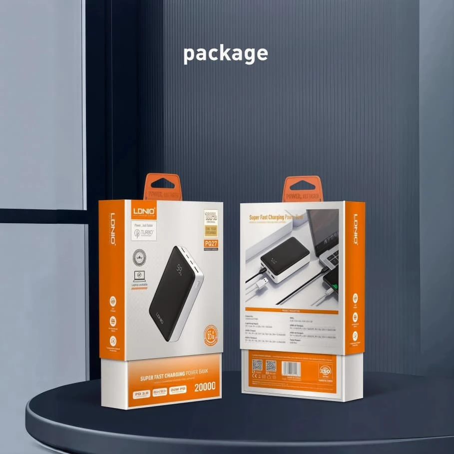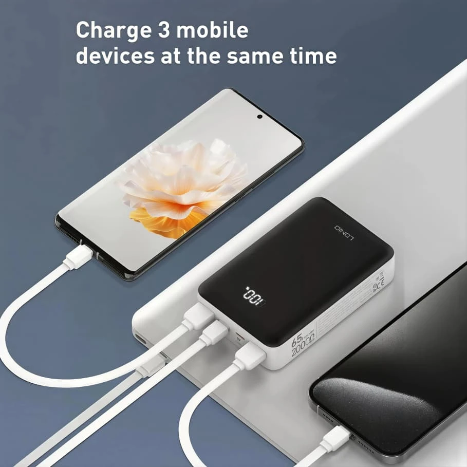 The LDNIO Power Bank PQ27 is a high‑capacity portable charger with 20,000 mAh of power, allowing multiple charges for smartphones, tablets, and other devices without being connected to a wall outlet. It supports fast charging up to 65 W via the USB‑C port for efficient device charging, and includes USB‑A ports with up to 22.5 W output for additional devices simultaneously. The power bank also features advanced safety protections such as overcharge and short‑circuit protection to keep your devices safe while on the go.