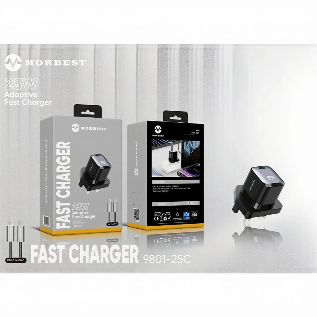 The MORBEST 9801-25C is a 25W adaptive fast charger designed with a Type-C output port for stable and efficient charging. It comes with a USB-C to USB-C cable for immediate use without needing additional accessories. It supports modern fast charging technologies such as USB Power Delivery (depending on device compatibility), ensuring safe and efficient charging for smartphones and tablets. Its compact and lightweight design makes it ideal for home and travel use.