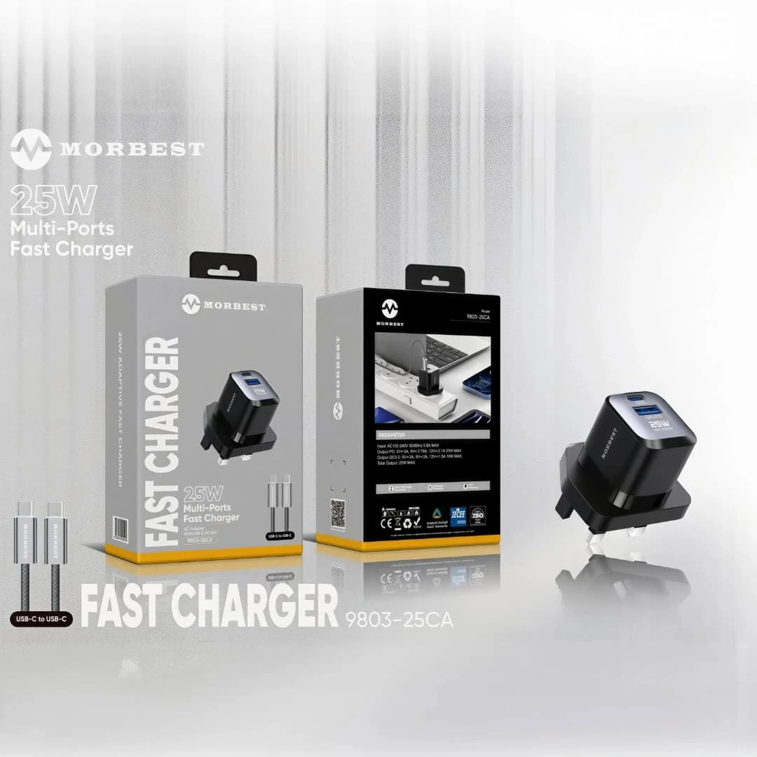 The MORBEST 9803-25CA is a 25W multi-port fast charger designed to charge multiple devices efficiently. It includes a USB-C port for fast and stable charging performance. The charger comes with a USB-C to USB-C cable for immediate use. It supports modern fast charging technologies such as Power Delivery (depending on device compatibility), and features a compact, travel-friendly design ideal for everyday use.