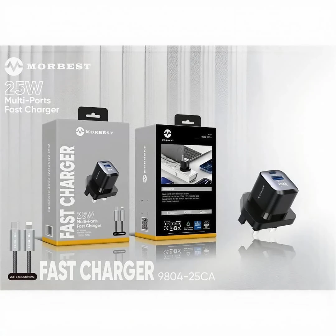The MORBEST 9804-25CA is a 25W multi-port fast charger designed to quickly and efficiently charge devices using both USB-A and USB-C ports. It allows simultaneous charging of multiple devices with stable and reliable performance. It supports modern fast charging technologies (depending on device compatibility) and features smart power distribution for optimal charging speed. Its compact and lightweight design makes it ideal for home and travel use.