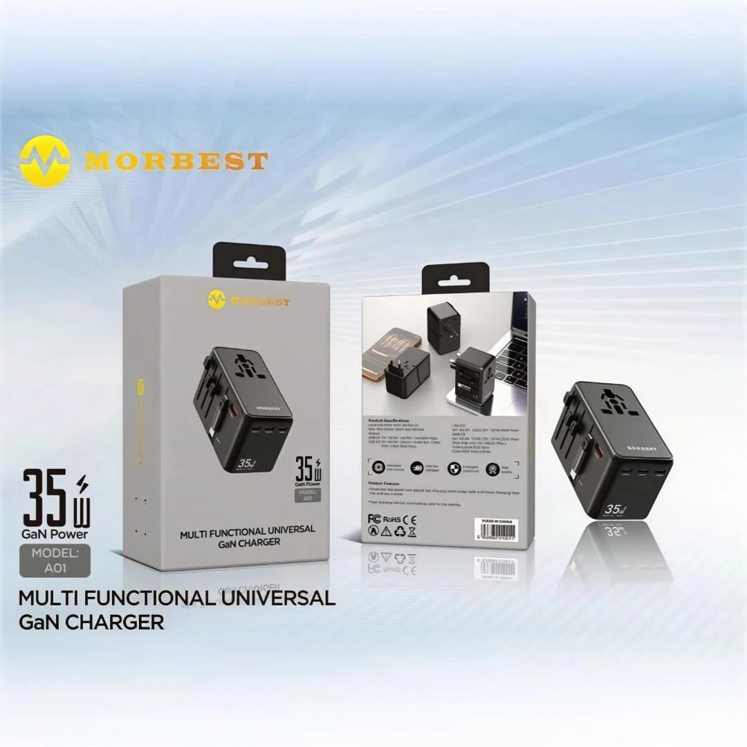 The MORBEST A01 is a multi-functional universal charger featuring GaN technology, delivering efficient power output in a compact and portable size. It is designed for international travel, with support for multiple plug types compatible with different countries. It allows charging multiple devices simultaneously with fast and stable performance, supporting modern charging technologies (depending on device compatibility). Its compact design makes it an ideal travel companion, eliminating the need for multiple chargers.