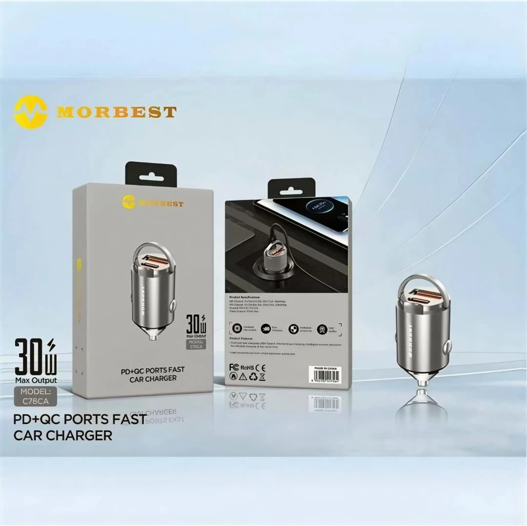 The MORBEST C76CA is a 30W multi-port fast car charger designed to charge multiple devices simultaneously with high efficiency. Its multi-port design offers greater flexibility, making it suitable for smartphones, tablets, and other electronic devices. It supports fast charging technologies (depending on device compatibility) and ensures stable and safe performance during use. Its compact design fits easily into a car cigarette lighter socket, making it perfect for daily use and travel.