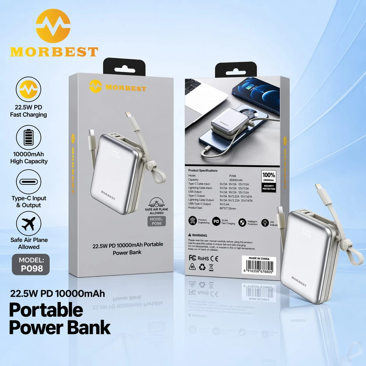 The MORBEST P098 is a 10000mAh portable power bank designed for fast and efficient charging on the go. It supports Power Delivery (PD) fast charging with up to 22.5W output for quicker device charging. Its compact and lightweight design makes it easy to carry in a pocket or bag, making it ideal for daily use and travel. It provides safe and stable charging for smartphones and other electronic devices.