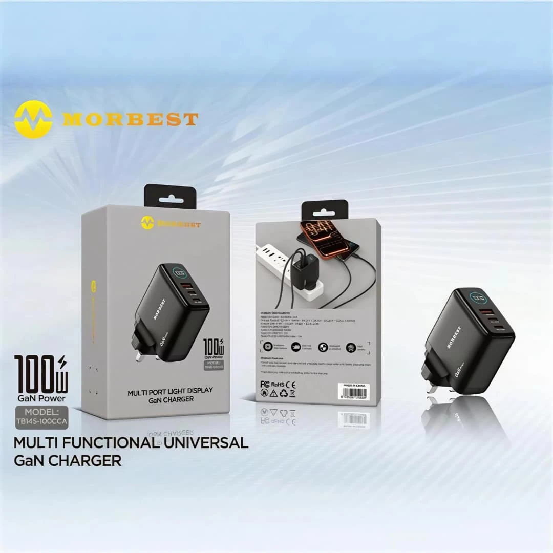 The MORBEST TB145-100CCA is a powerful 100W multi-port fast charger featuring advanced GaN (Gallium Nitride) technology for high efficiency and compact size. It is designed to deliver fast charging for smartphones, tablets, and compatible laptops. The charger supports intelligent power distribution, allowing multiple devices to be charged simultaneously with optimal performance. It also supports modern fast charging technologies such as Power Delivery (depending on device compatibility). Its compact and durable design makes it ideal for home, office, and travel use.