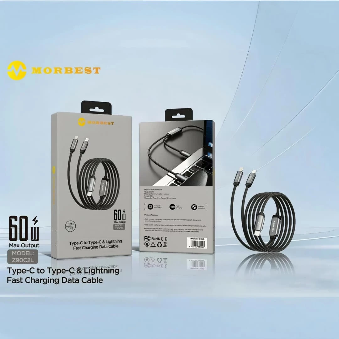 The MORBEST Z90C2L is a 1.2-meter fast charging cable designed with Type-C to Type-C and Lightning compatibility for versatile use across different devices. It supports fast charging with up to 60W power output, ensuring efficient performance. The cable features a durable and practical design suitable for daily use, with support for both charging and data transfer. Ideal for smartphones, tablets, and other compatible devices.